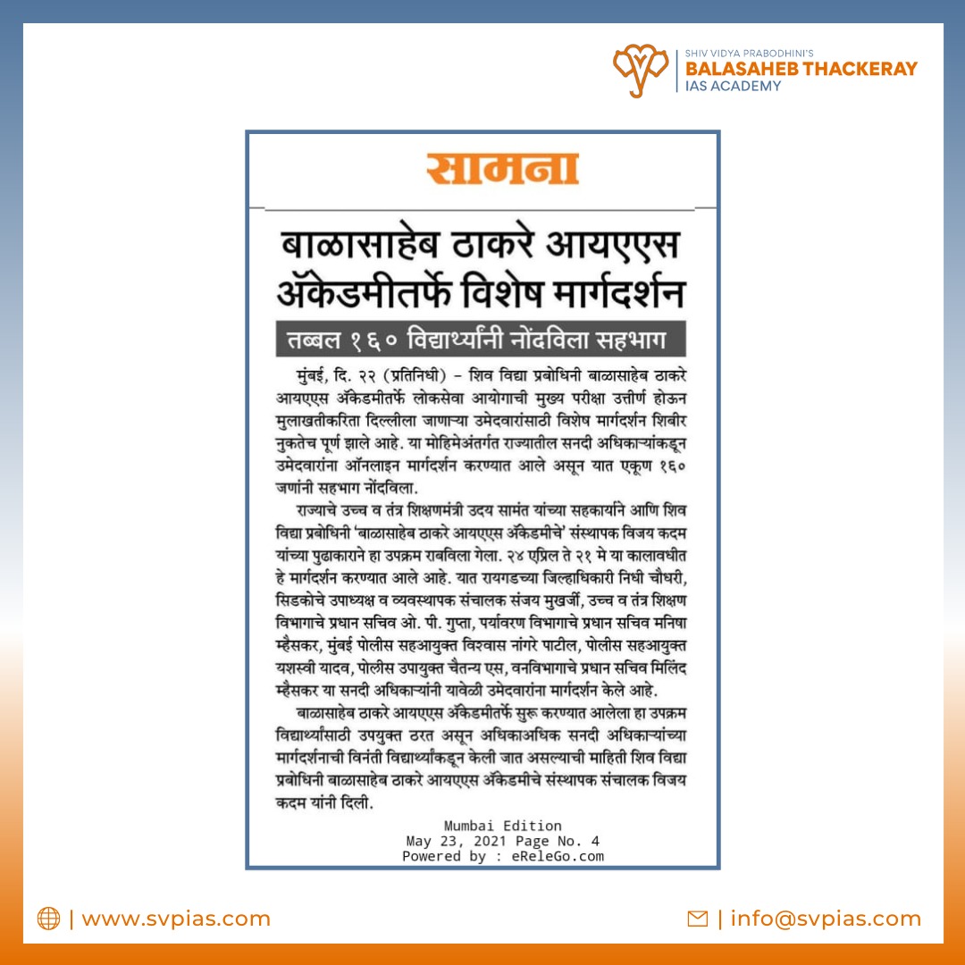 Shiv Vidya Prabhodhini Balasaheb Thackeray IAS Academy Mumbai has been offering educational services to the students preparing for the civil services exam. Mumbai is not merely a financial hub. It has a rich culture and history which in turn gives a glimpse into crucial moments, decisions that ultimately shaped the history of our Nation. Inspite of rich contributions all their life by Statesman-Educationists such as Jaggannath Shankarsheth and Dr. Bhau Daji Lad (Ramkrishna Vithal Lad), the City is yet deprived of a dedicated, quality institute imparting training for Civil Services Examinations to Mumbai’s talent pool. It’s our humble effort to providefor the same.There are so many myths and misgivings about IAS Academy mumbai,civil Services in Mumbai and the experience tells us that this is because of minimal exposure to the Civil Services amongst the Student fraternity of Mumbai. It shall be our endeavour to burst these myths, cleanse of the misgivings and expose the students early in life to the Careers in Civil Services so that the crucial time is not wasted.